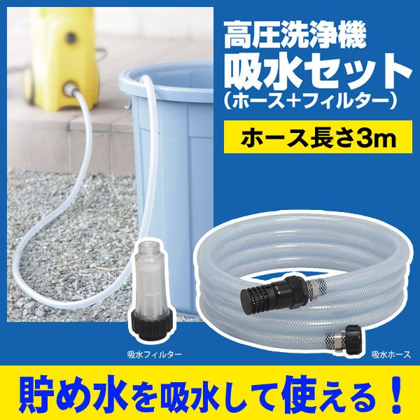 貯めた水を使える、高圧洗浄機専用ホース!! 貯め水を吸水する際に使用する、 高圧洗浄機専用吸水ホースとフィルターのセットです。